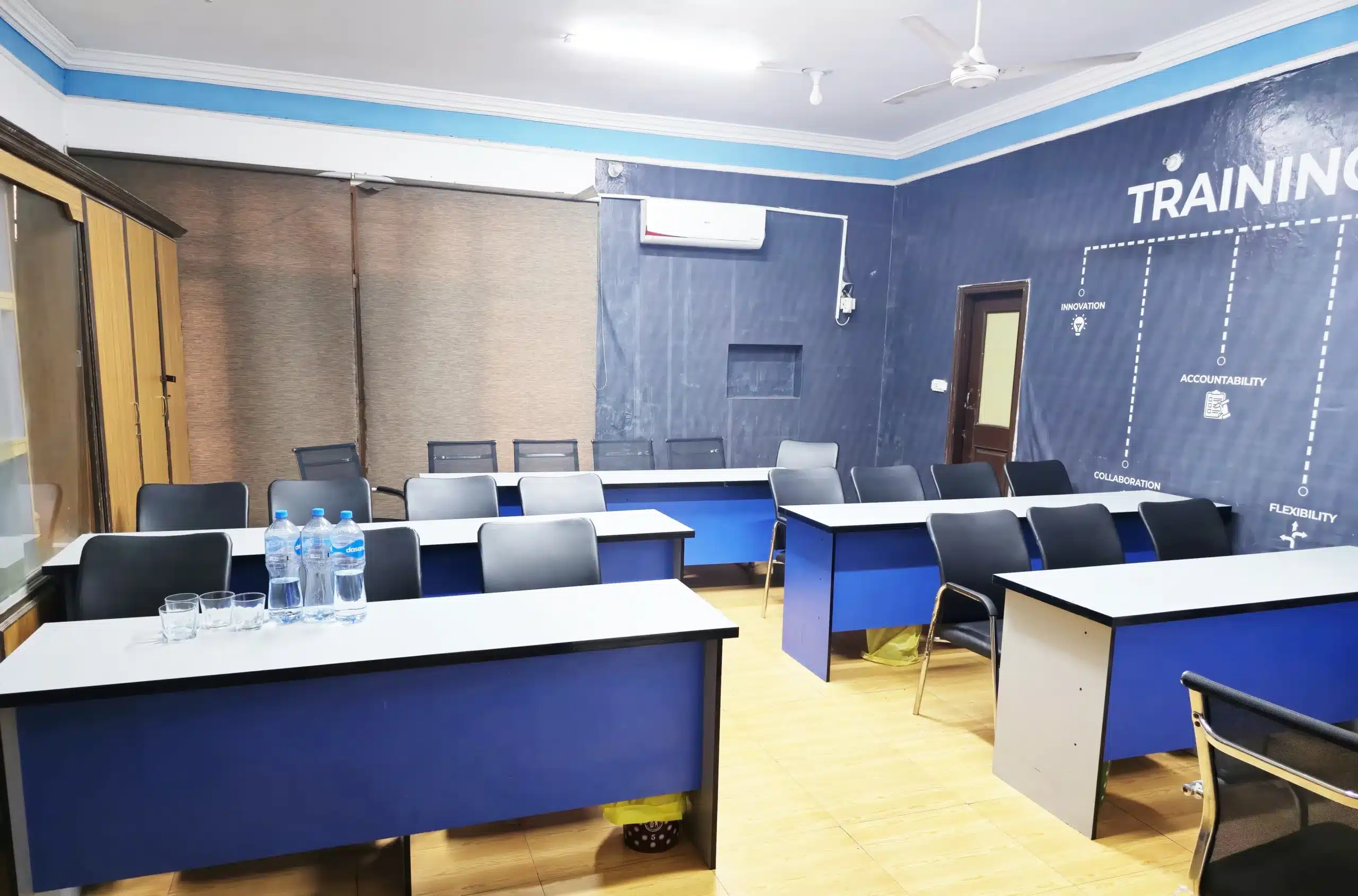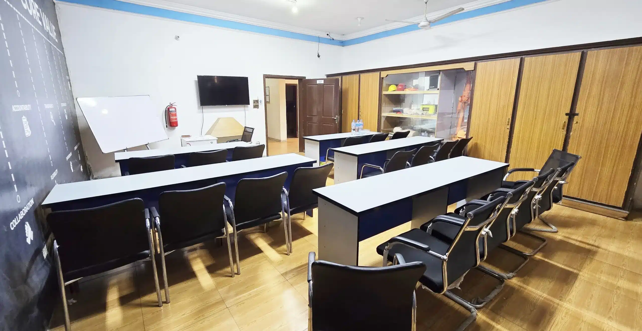The facility includes two state-of-the-art training rooms of different sizes, fully equipped with modern learning technologies that foster an interactive and collaborative learning environment. The non-slippery flooring, cleaned daily, ensures safety and hygiene. Each training room is equipped with LED displays, while our Executive Training Room features a projector for wide-format presentations. All rooms benefit from natural light and ventilation through large windows, along with air-conditioning, heating, and well-designed lighting that meets the required lux levels for learning spaces. Comfortable seating, ergonomic chairs, and functional tables support long training sessions with ease.